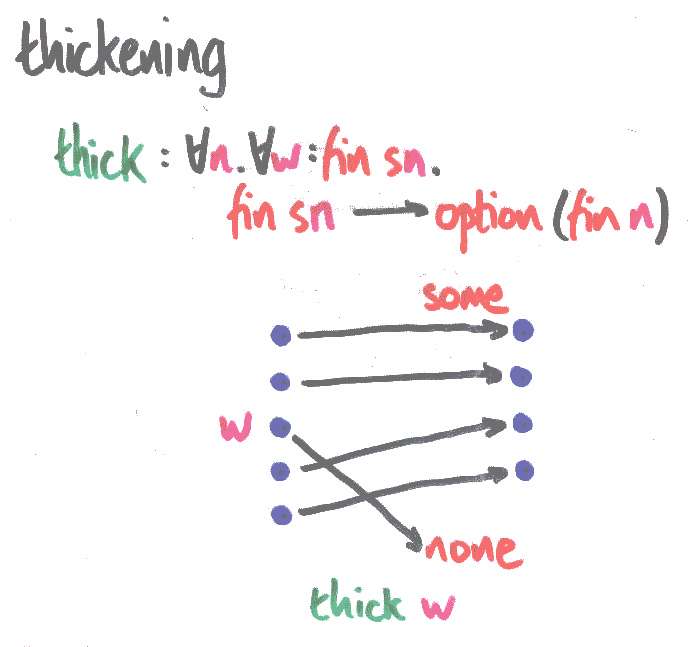 thick w attempts to compress the space of variables by throwing away w. This goes wrong if we're applying it to w, but is fine otherwise. I use option types to pass exceptions.