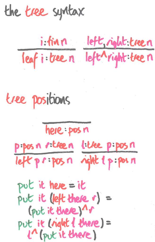 A position is a path from the root of a tree to a deleted subtree, recording the subtrees passed on the way. It's a one-hole context, and the put function puts a tree in the hole. These things are a bit like Huet's `zippers', but he gives the path from the deleted subtree back to the root---a more flexible presentation in general, but slightly more awkward for the work in this talk.