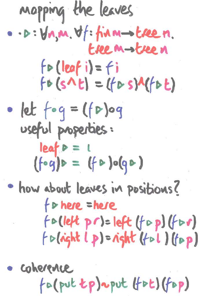 Now that I'm overloading it, I might as well carry on and let |> map renamings too. For example, two slides on, I wrote (thin w) |>, when I should have written (leaf o (thin w)) |>, and I'm trying to sweep that mistake under the carpet. Of course, if we buy Luo-Soloviev-Bailey-Jones coercive subtyping, we can get away with it on the machine, as well on slides.