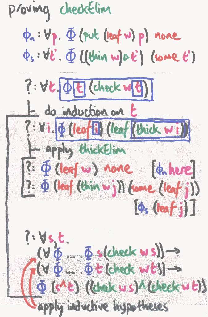 I wonder how easy it would be to automate this proof. It strikes me that I should get checkElim free of charge, when I decide to implement the spec by a structural recursion on the tree. Come to think of it, I should extract the structural recursion from the structurally monotonic behaviour of |> and put. This is what I was aiming at when I was working on a calculus of `rumours'.