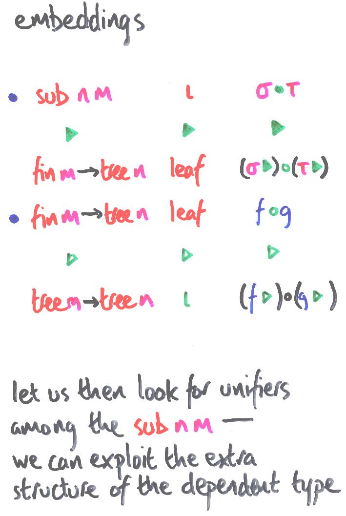 This slide just summarises the way we've narrowed the focus from tree-to-tree functions to simultaneous substitutions, then to the concrete datatype of idempotent substitutions.
