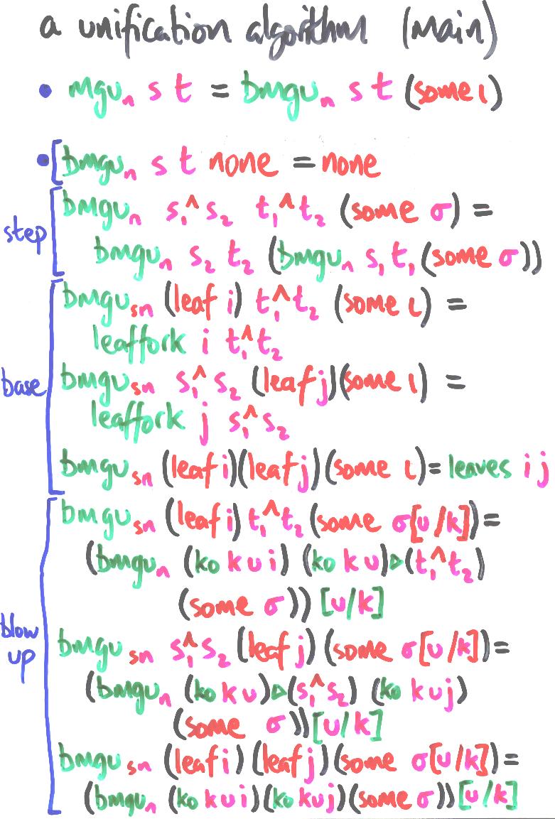 Do I really need the induction on the source number of variables? I don't believe I can get away with just an outer structural recursion on the accumulator. Think what happens to the rigid-rigid case when the accumulator is iota: I can only make recursive calls with accumulator iota, so I can't pass the accumulator from one branch to the other. Induction on the source number allows me any substitution descending from that set of variables.
