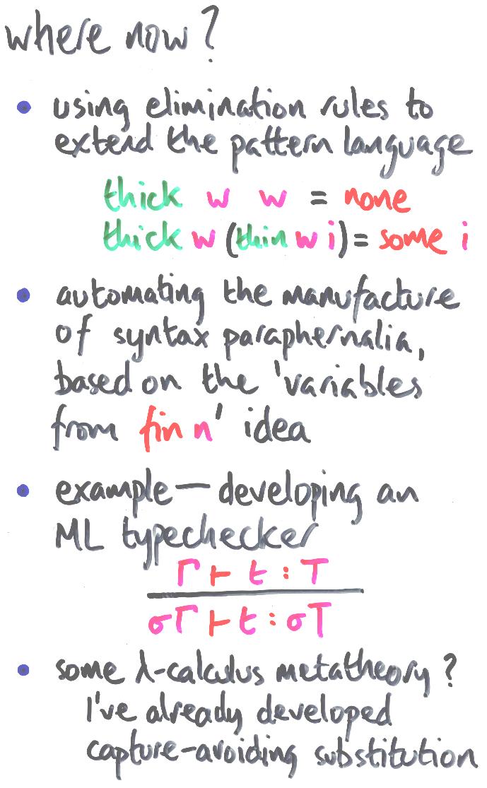 Instead of writing thick directly, I can prove an elimination rule for fin sn which, for any given w performs case analysis between `patterns' w and (thin w j). If this rule eliminates over datatypes, I can use it to write programs. In particular, the program for thick moves a great deal closer to its specification.