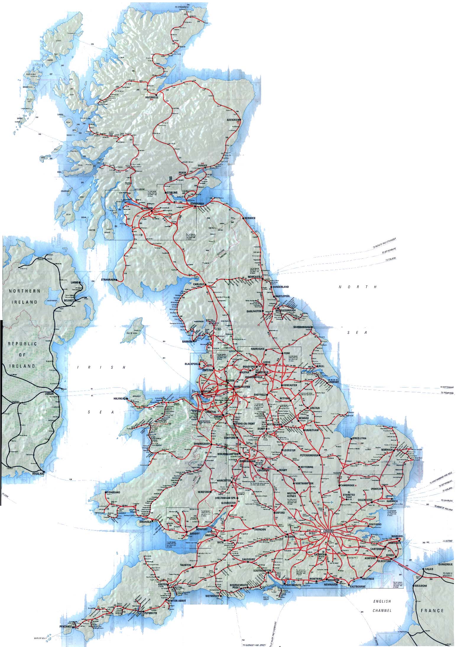 You can find a larger, almost legible, but (naturally) unclickable version of the map here. The real railway, post privatization is allegedly run by Railtrack. Of course, they chopped up the actual running trains bit into lots of different companies, so now you haven't a clue what's going on. Train conductors are forced to wear silly degrading uniforms and to be totally inflexible about allowing you to do what it'd be sensible for you to do if it might involve thrupence ha'penny going to another operator. The railway used to be run by humans for humans. Now it's run by paranoid zombies for shareholders, shunting disgruntled zombies about the place whenever they can find a driver.